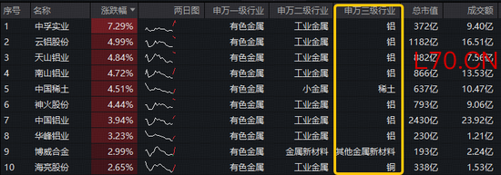 成份股方面,铝业龙头显著领涨,中孚实业涨超7%,云铝股份、天山铝业、南山铝业涨逾4%,神火股份、中国铝业、华峰铝业等个股跟涨。此外,中国稀土涨超4%,博威合金、海亮股份涨逾2%。